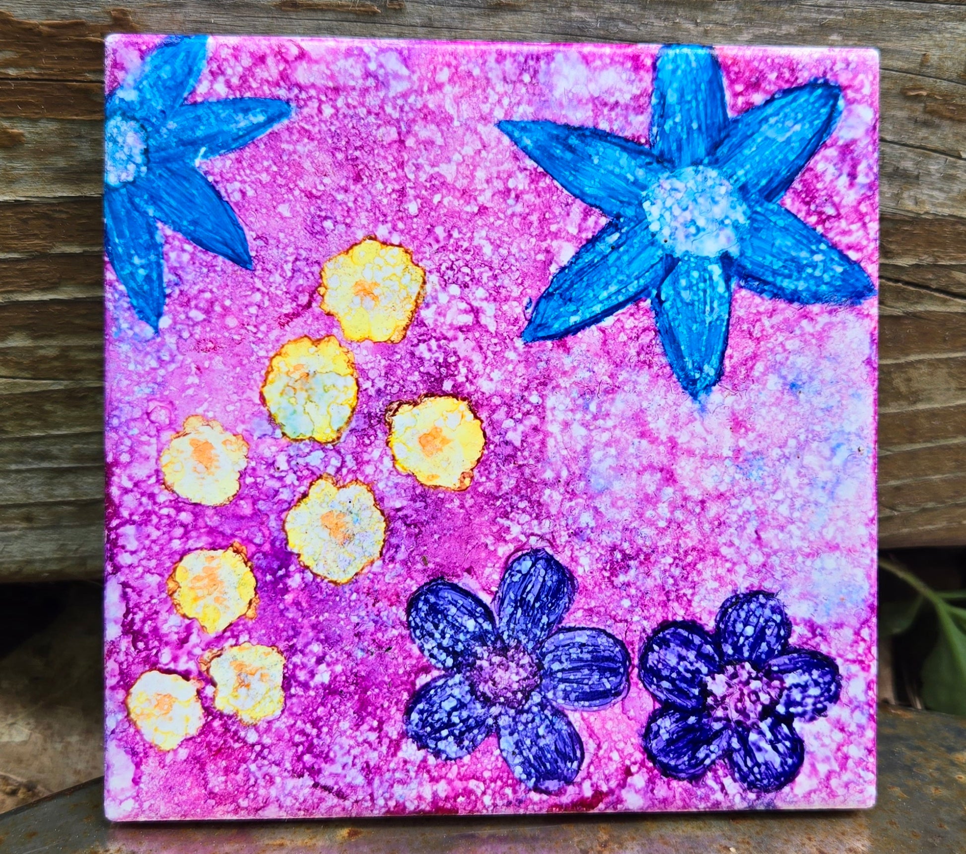 These hand painted tiles are crafted with alcohol inks, showcasing their vibrant colors and stunning designs. A versatile piece, it can be displayed on walls or tabletops, adding a touch of beauty to any space. Elevate your decor with these unique tiles. Experience the beauty and artistry of our hand painted tiles!