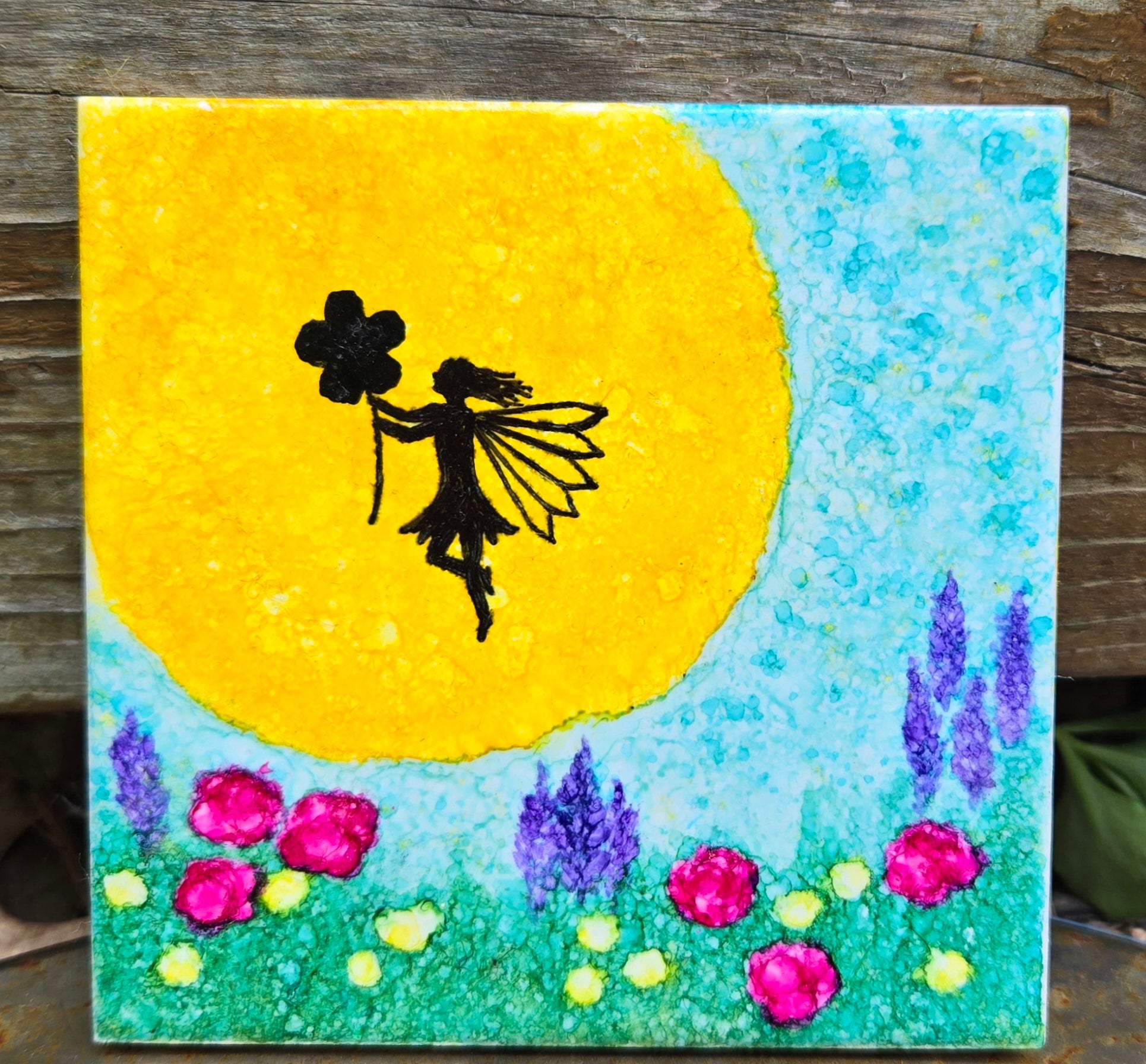 These hand painted tiles are crafted with alcohol inks, showcasing their vibrant colors and stunning designs. A versatile piece, it can be displayed on walls or tabletops, adding a touch of beauty to any space. Elevate your decor with these unique tiles. Experience the beauty and artistry of our hand painted tiles!